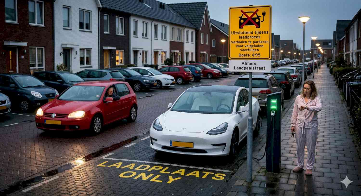Dan het volgende probleem, en dit is waar het echt absurd wordt. Je hebt een elektrische auto, je vindt een laadplek, prima. Je gaat slapen. Midden in de nacht is je accu vol. Maar je mag niet blijven staan dat heet laadpaalkleven. Logica snap ik wel: de plek moet vrij voor de volgende. Maar waar zet je die auto dan neer om drie uur 's nachts? Precies op een van die gewone plekken die we net hebben opgeofferd voor diezelfde laadpaal.