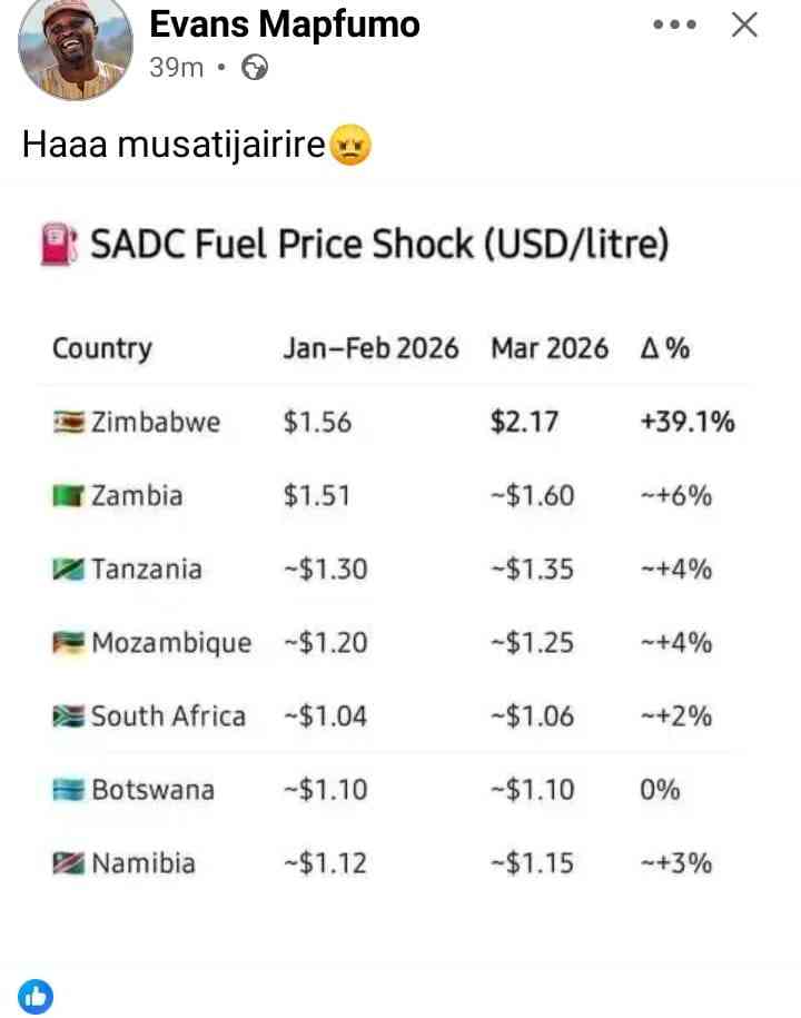 Vandaag kreeg ik een foto van de benzineprijzen in de buurlanden van Zimbabwe. En wat blijkt? In de buurlanden van Zimbabwe is de benzineprijs lager! Net als bij ons. In België en Duitsland liggen de prijzen ook een stuk lager.