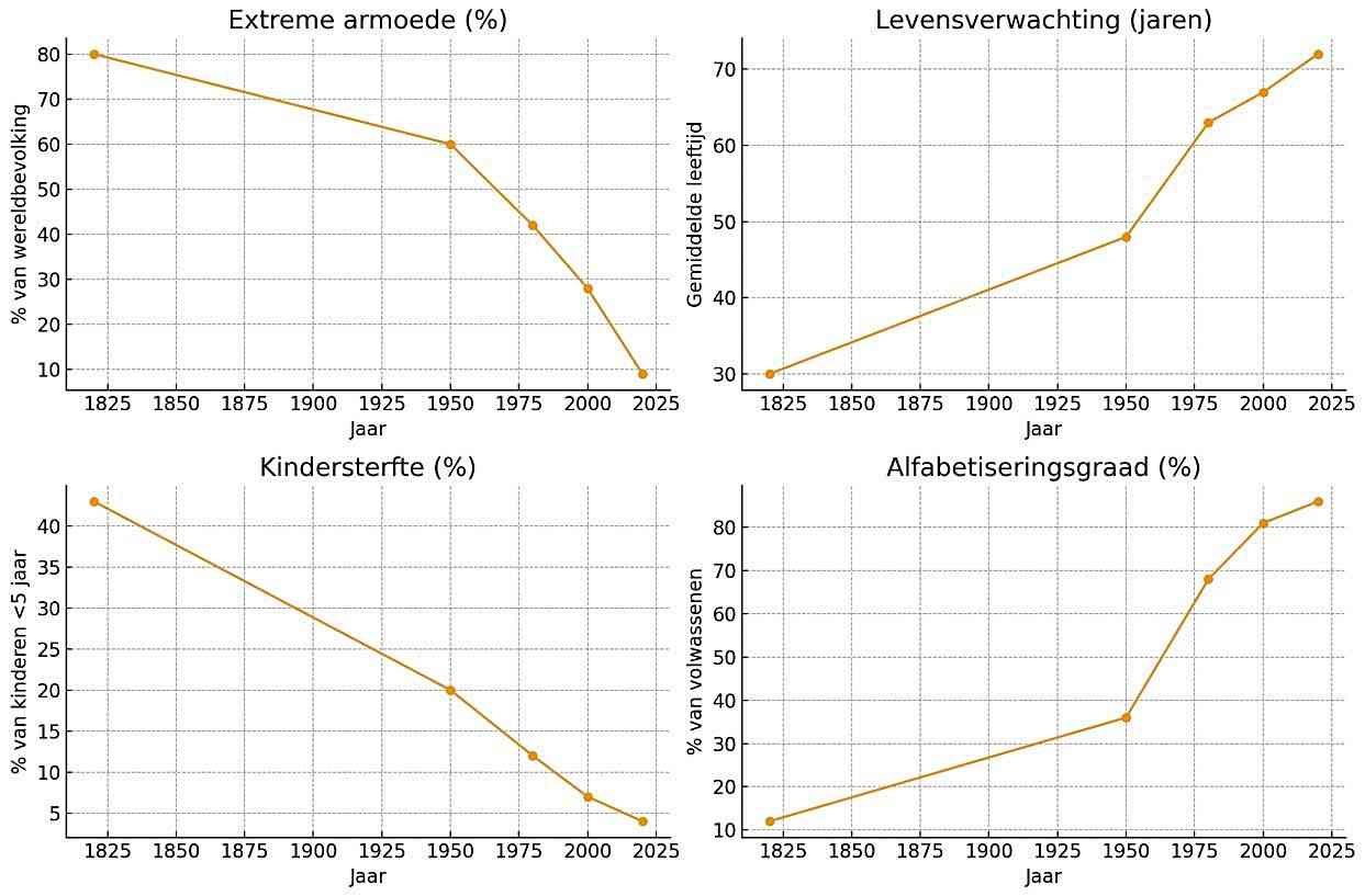 Grafiek: Hier ziet u vier belangrijke indicatoren die aantonen dat de mensheid er historisch gezien beter voor staat dan ooit: