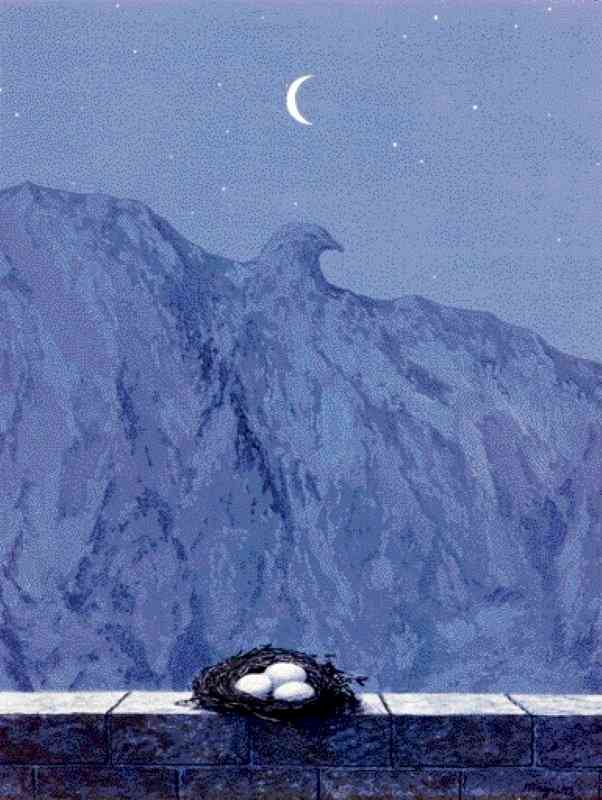 Het domein Arnheim verwijst naar een verhaal van Edgar Allan Poe. Het vertelt over de rijke Ellison, die een ideaal landschap, "Arnheim", wil creëren. Zo wilt Margritte ook een ideaal landschap creëren. Het rotslandschap is een arend geworden. Of is de arend een rotslandschap geworden? Maan, arend en eieren liggen in 1 lijn. Wat rust geeft.