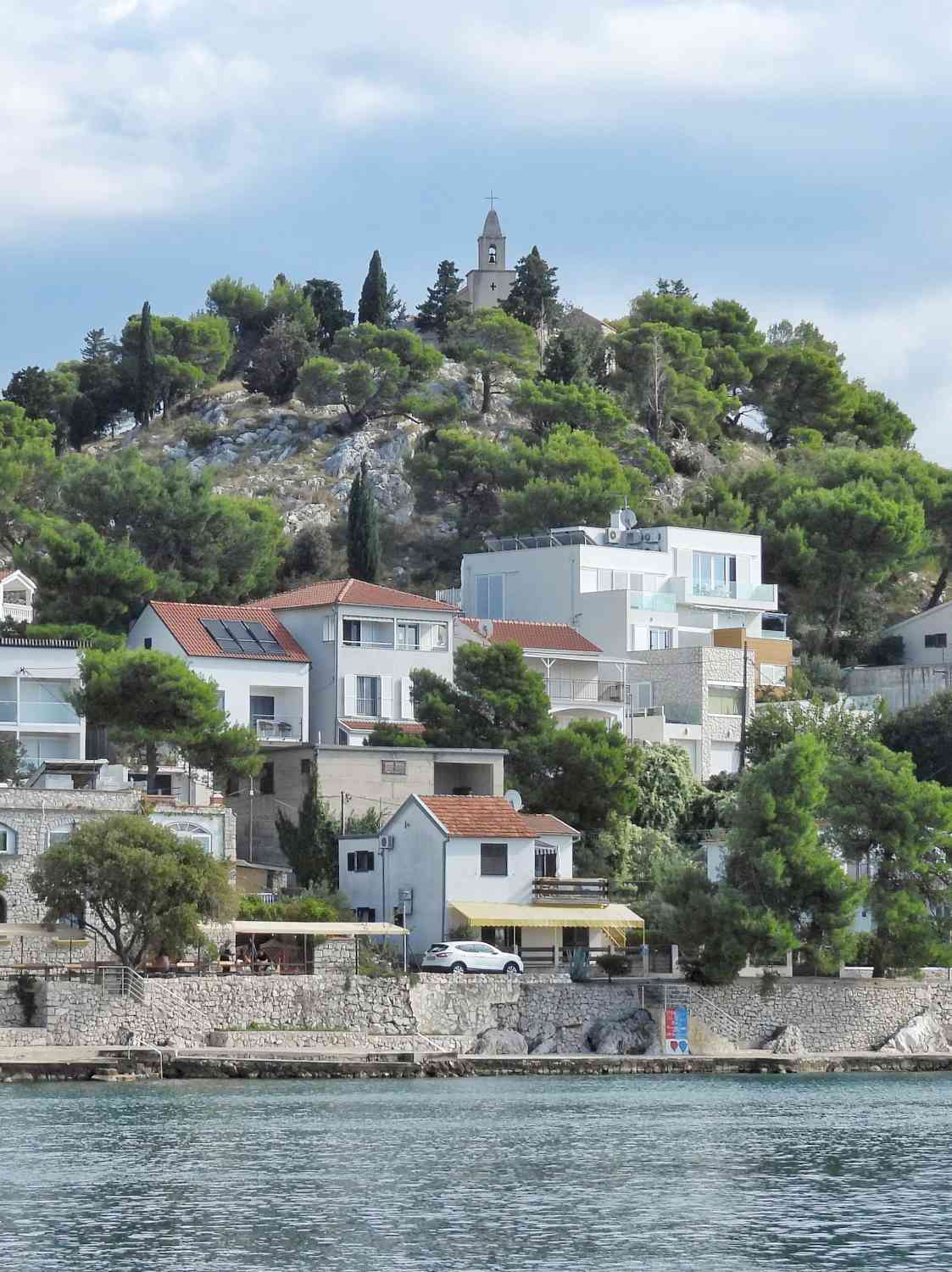 Het kerkje van Svati Nikole torent overal bovenuit in Tribunj (Kroatië).