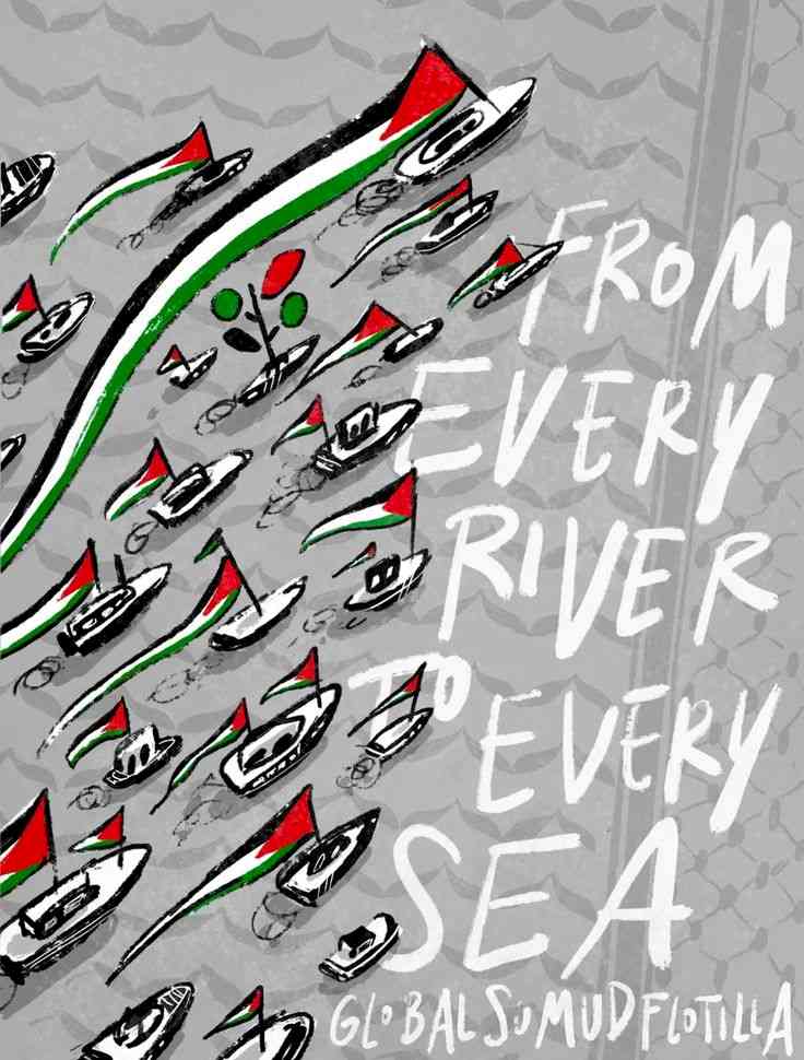 Sterrenlicht @VinKonings Ik zag het aan de vlaggen die op de boten wapperen. De afbeelding toont een illustratie van de Global Sumud Flotilla. De tekst "FROM EVERY RIVER TO EVERY SEA" is een slogan die vaak wordt gebruikt in de context van Palestijnse solidariteit.