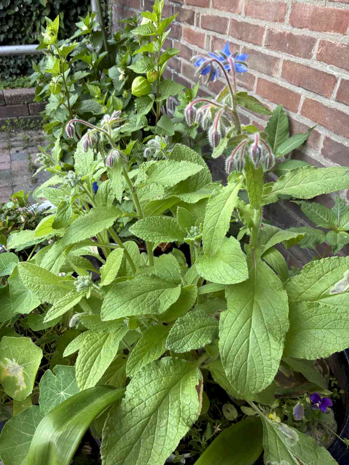 Bernagie, Borago officinalis, herken je tijdens de bloei aan de stervormige tamelijk grote bloemen van ruim 2 cm in doorsnede. De bloemen, meestal blauw van kleur, staan een beetje naar opzij gebogen aan de met stevige haren bezette planten. Bovenin de plant zitten de langwerpige bladeren verspreid, terwijl onder in de plant eivormige gesteelde bladeren staan. De bloemen lijken wel wat op die van sommige plantensoorten uit de Nachtschadefamilie.