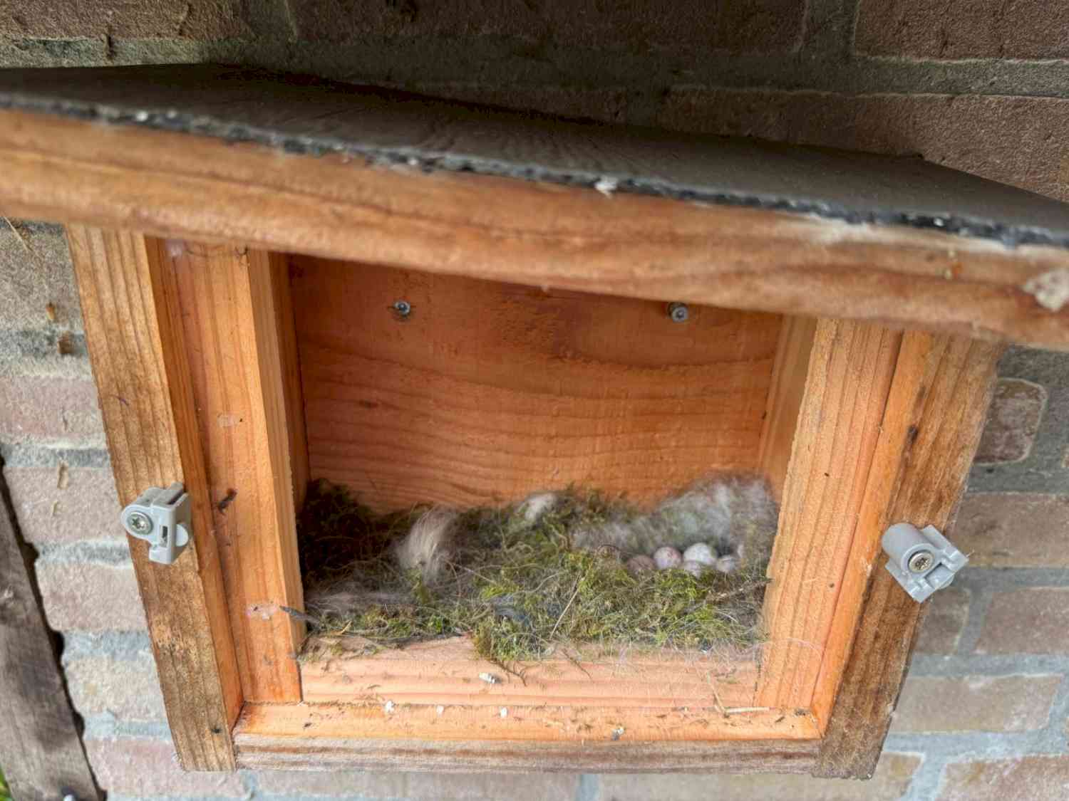 Ik wilde het kastnestje schoonmaken. Ik trof een schattig gemaakt nestje aan. Maar er lagen nog 6 eitjes in. Een eitje was gebroken, want die was kennelijk uitgekomen.