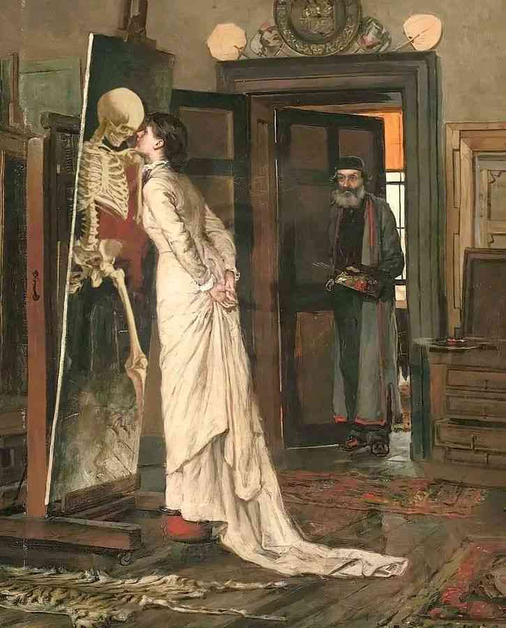 Deze tekst stond bij deze afbeelding. Het schilderij beeldt een vrouw uit die een kust geeft aan een skelet. terwijl een oudere man met een palet in zijn hand toekijkt vanuit de deuropening.