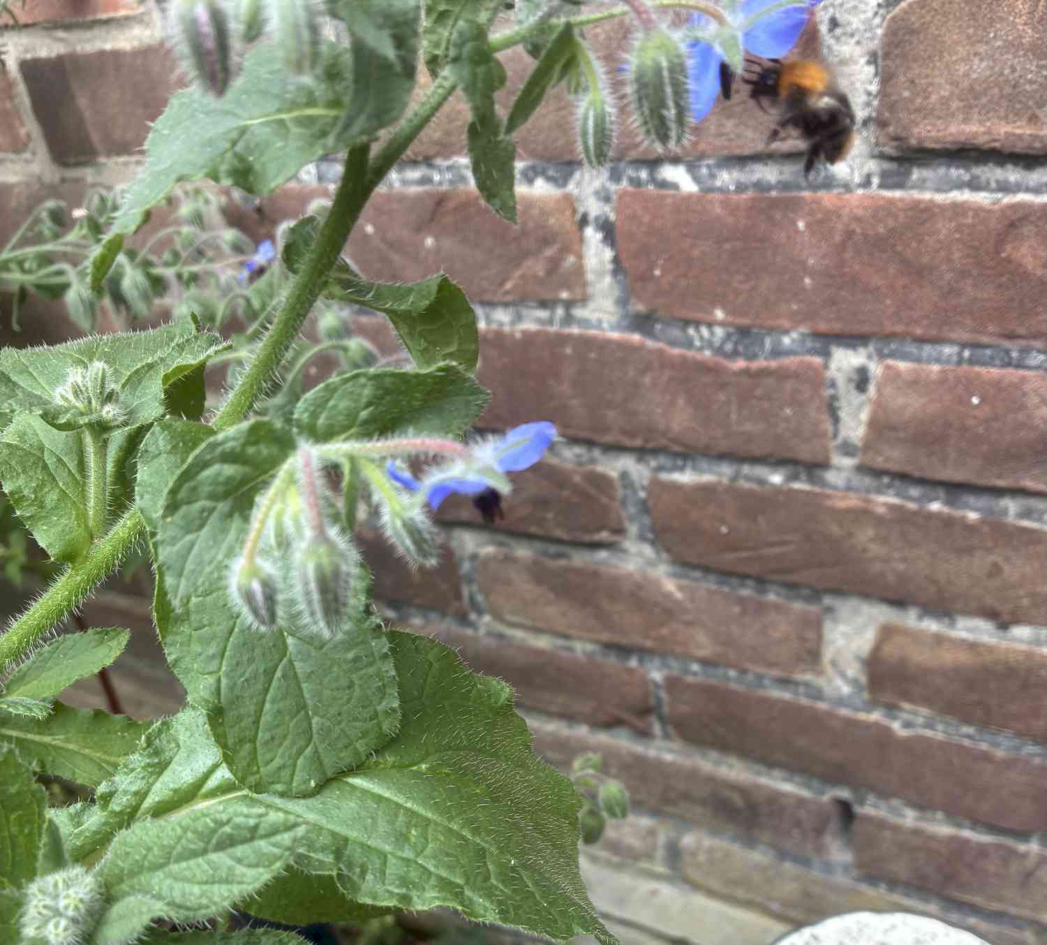 Rechts boven probeert een hommeltje honing uit de plant te halen.