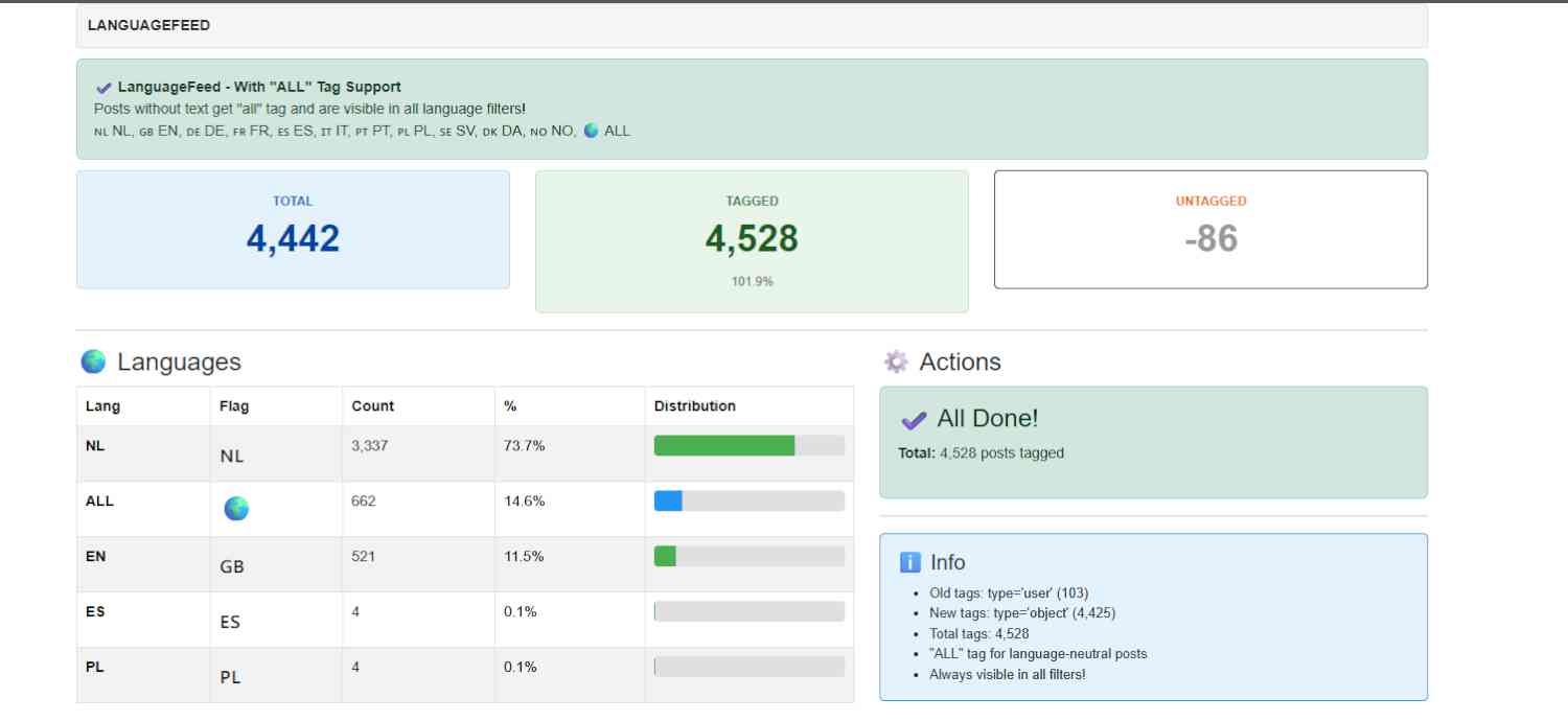 Elke nieuwe post krijgt automatisch een taal-label (bijv. NL, EN, DE, …).