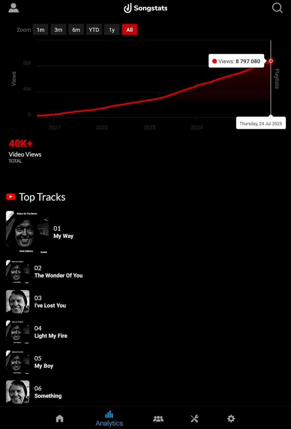 Bijna 9 miljoen views op YouTube en You Tube Music met mijn liedjes en video's, heel veel dank aan iedereen. Afbeelding is een screenshot van songstats.com