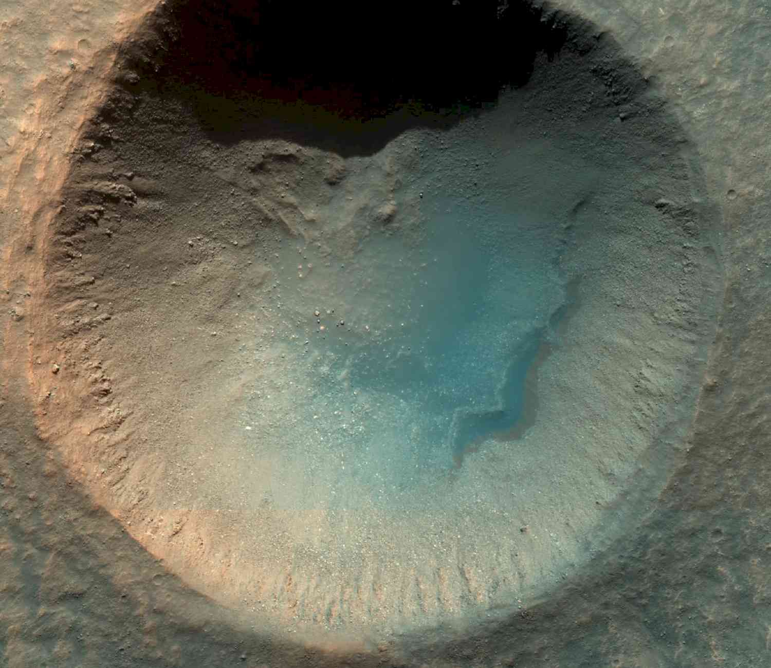 Een foto van een krater op het oppervlak van Mars, gemaakt vanuit een omloopbaan. Diameter (slechts) 1 km. #tisprachtigdaarboven