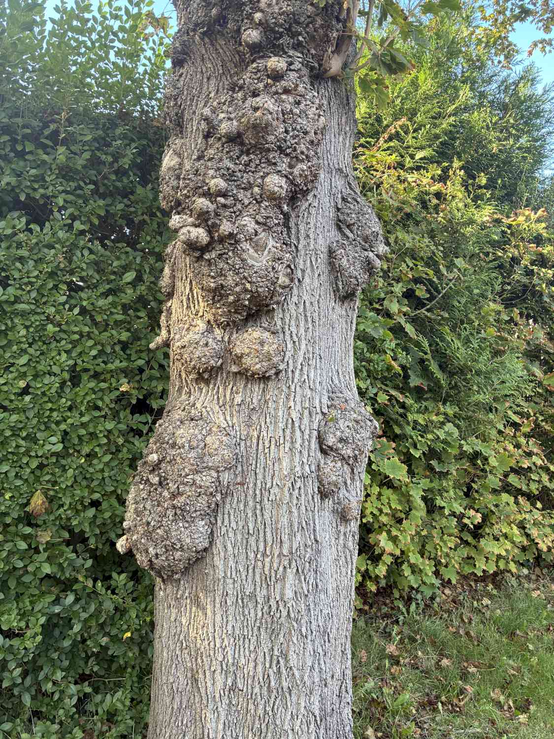 Woekeringen (burls): De grote, knobbelige uitgroeisels op de stam zijn burls. Deze kunnen ontstaan door diverse factoren, zoals verwondingen, insecten, schimmels of bacteriën, en zijn relatief vaak te zien op eiken.