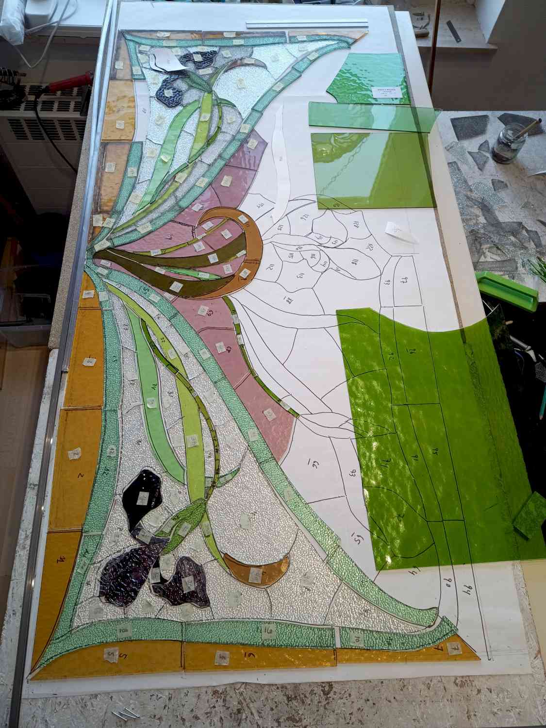 Restauration d'un panneau en vitrail traditionnel. Un bouquet d'Iris.
