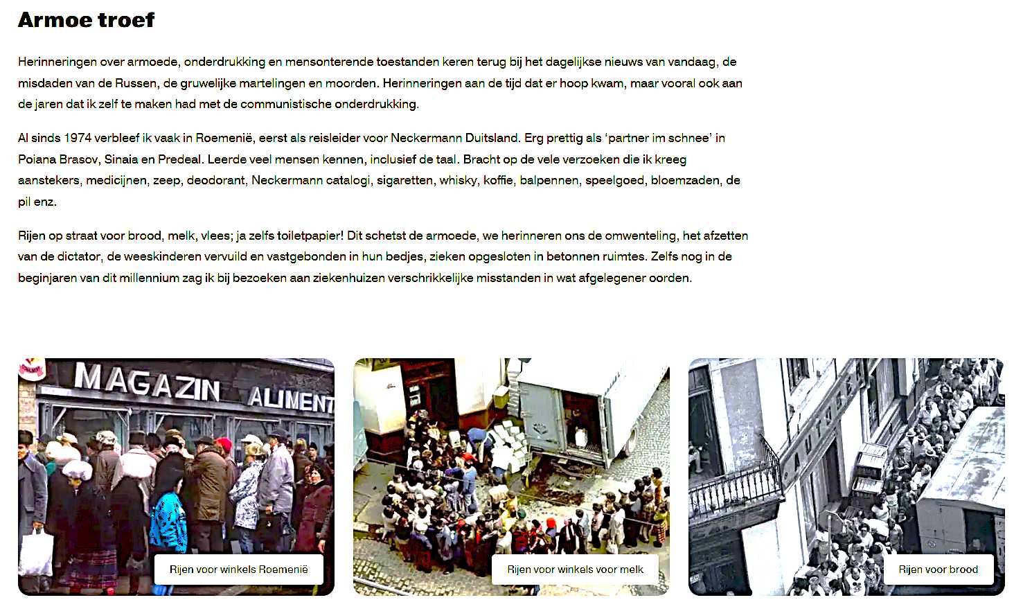 Rijen op straat voor brood, melk, vlees; ja zelfs toiletpapier! Dit schetst de armoede, we herinneren ons de omwenteling, het afzetten van de dictator, de weeskinderen vervuild en vastgebonden in hun bedjes, zieken opgesloten in betonnen ruimtes. Zelfs nog in de beginjaren van dit millennium zag ik bij bezoeken aan ziekenhuizen verschrikkelijke misstanden in wat afgelegener oorden.